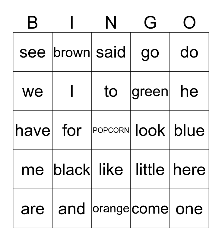 This bingo card has a free space and 35 words: a, my, the, I, like, go, we, on, to, you, have, do, what, no, see, look, come, for, me, one, little, are, here, and, said, he, she, red, green, blue, yellow, orange, black, brown and purple.