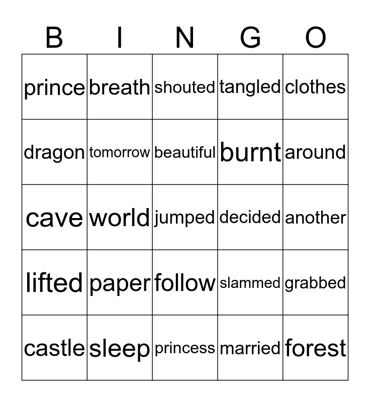This bingo card has 25 words: paper, princess, beautiful, castle, clothes, prince, dragon, breath, decided, follow, burnt, cave, slammed, grabbed, tomorrow, forest, another, shouted, around, world, jumped, sleep, lifted, tangled and married.