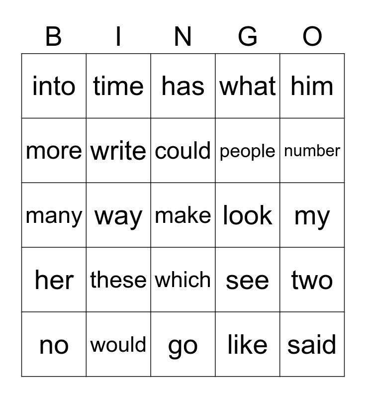 This bingo card has 25 words: her, would, make, like, him, into, time, has, look, two, more, write, go, see, number, no, way, could, people, my, many, these, which, what and said.