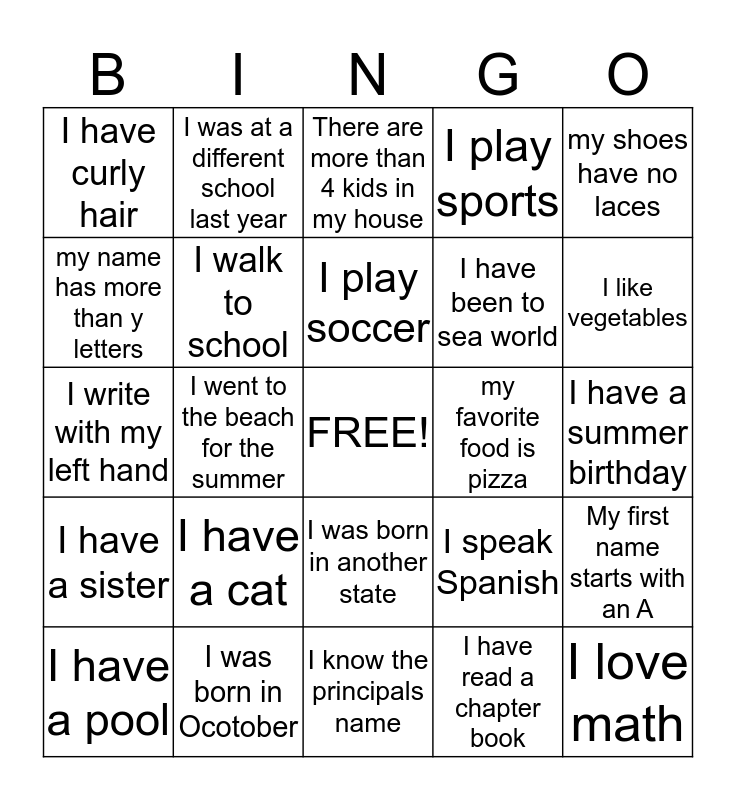 This bingo card has a free space and 24 words: I have a cat, I was born in Ocotober, I play soccer, I have a pool, my shoes have no laces, I have curly hair, my name has more than y letters, I was at a different school last year, my favorite food is pizza, I was born in another state, I have been to sea world, I write with my left hand, I speak Spanish, My first name starts with an A, I walk to school, I have read a chapter book, I have a summer birthday, There are more than 4 kids in my house, I like vegetables, I went to the beach for the summer, I love math, I have a sister, I play sports and I know the principals name.