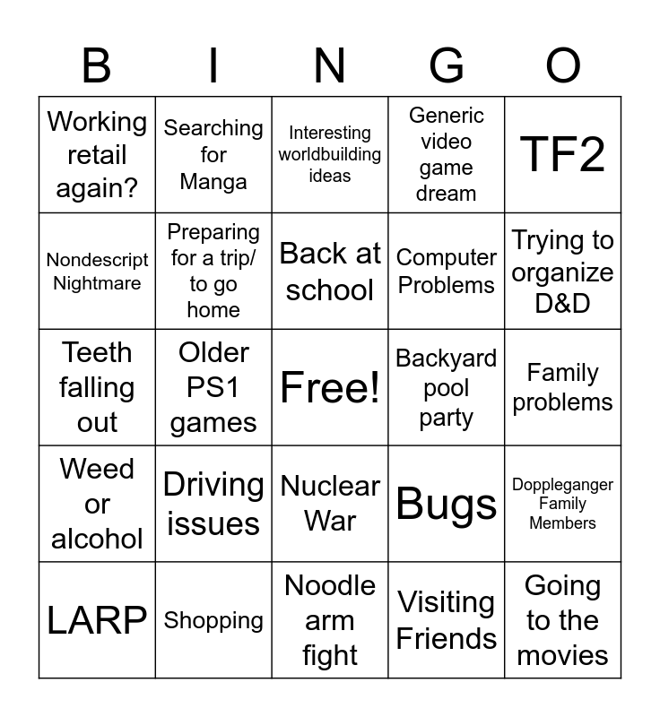 This bingo card has a free space and 24 words: Driving issues, Shopping, Back at school, LARP, TF2, Working retail again?, Nondescript Nightmare, Searching for Manga, Backyard pool party, Nuclear War, Computer Problems, Teeth falling out, Bugs, Doppleganger Family Members, Preparing for a trip/ to go home, Visiting Friends, Family problems, Interesting worldbuilding ideas, Trying to organize D&D, Older PS1 games, Going to the movies, Weed or alcohol, Generic video game dream and Noodle arm fight.