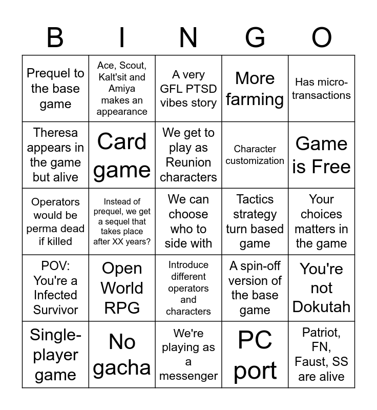 This bingo card has a free space and 24 words: Open World RPG, No gacha, We get to play as Reunion characters, Single-player game, Has micro-transactions, Prequel to the base game, Theresa appears in the game but alive, Ace, Scout, Kalt'sit and Amiya makes an appearance, Tactics strategy turn based game, Introduce different operators and characters, Character customization, Operators would be perma dead if killed, A spin-off version of the base game, You're not Dokutah, Card game, PC port, Your choices matters in the game, A very GFL PTSD vibes story, Game is Free, Instead of prequel, we get a sequel that takes place after XX years?, Patriot, FN, Faust, SS are alive, POV: You're a Infected Survivor, More farming and We're playing as a messenger.
