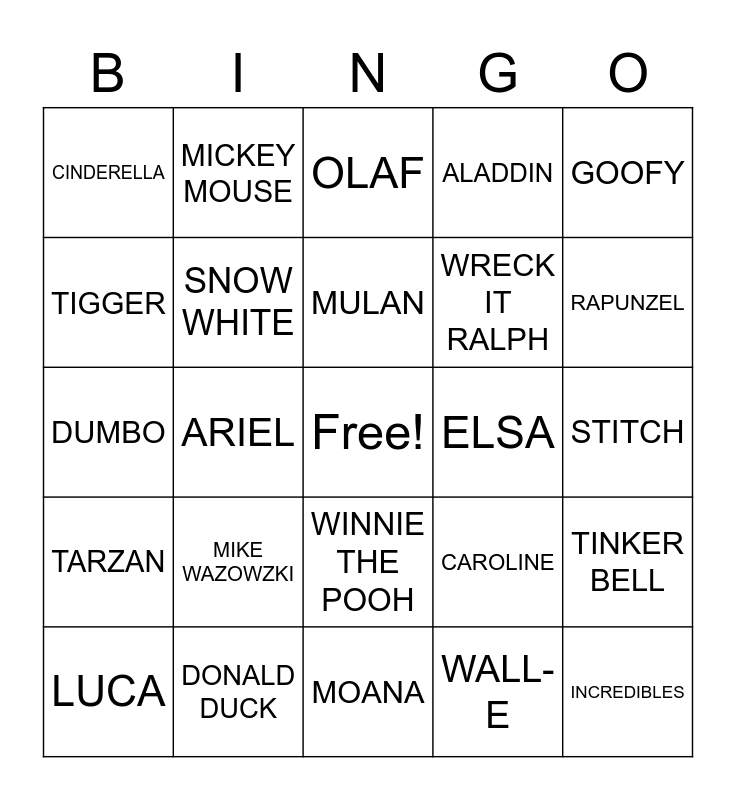 This bingo card has a free space and 24 words: MIKE WAZOWZKI, DONALD DUCK, MULAN, LUCA, GOOFY, CINDERELLA, TIGGER, MICKEY MOUSE, ELSA, WINNIE THE POOH, WRECK IT RALPH, DUMBO, CAROLINE, TINKER BELL, SNOW WHITE, WALL-E, STITCH, OLAF, RAPUNZEL, ARIEL, INCREDIBLES, TARZAN, ALADDIN and MOANA.