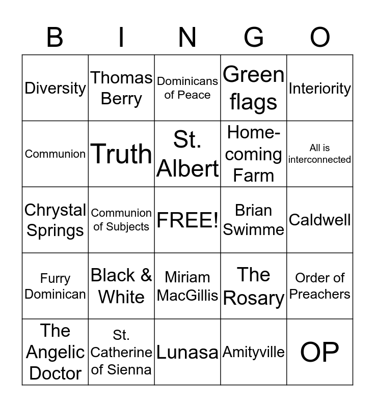 This bingo card has a free space and 24 words: Black & White, St. Catherine of Sienna, St. Albert, The Angelic Doctor, Interiority, Diversity, Communion, Thomas Berry, Brian Swimme, Miriam MacGillis, Home- coming Farm, Chrystal Springs, The Rosary, Order of Preachers, Truth, Amityville, Caldwell, Dominicans of Peace, All is interconnected, Communion of Subjects, OP, Furry Dominican, Green flags and Lunasa.