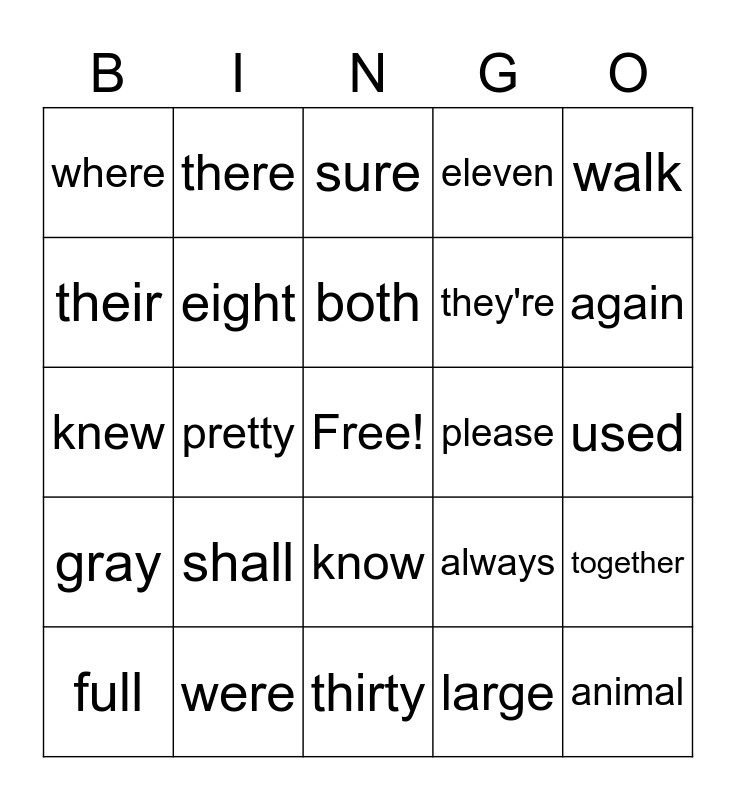 This bingo card has a free space and 24 words: shall, were, both, full, walk, where, their, there, please, know, they're, knew, always, together, eight, large, used, sure, again, pretty, animal, gray, eleven and thirty.