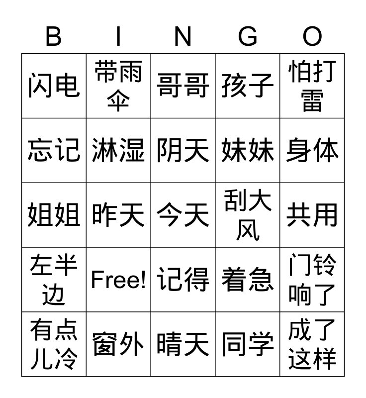 This bingo card has 25 words: Free!, 晴天, 阴天, 有点儿冷, 怕打雷, 闪电, 忘记, 带雨伞, 刮大风, 记得, 妹妹, 姐姐, 着急, 门铃响了, 淋湿, 成了这样, 共用, 哥哥, 身体, 昨天, 今天, 窗外, 左半边, 孩子 and 同学.