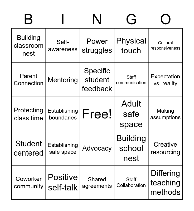 This bingo card has a free space and 25 words: Establishing safe space, Shared agreements, Specific student feedback, Coworker community, Cultural responsiveness, Building classroom nest, Parent Connection, Self-awareness, Adult safe space, Advocacy, Staff communication, Protecting class time, Building school nest, Creative resourcing, Mentoring, Courageous conversation, Making assumptions, Power struggles, Expectation vs. reality, Establishing boundaries, Differing teaching methods, Positive self-talk, Student centered, Physical touch and Staff Collaboration.