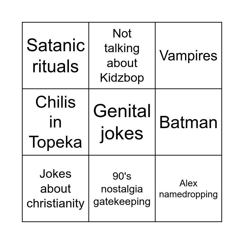 This bingo card has a free space and 8 words: Batman, Vampires, Not talking about Kidzbop, Jokes about christianity, Satanic rituals, Alex namedropping, Chilis in Topeka and 90's nostalgia gatekeeping.