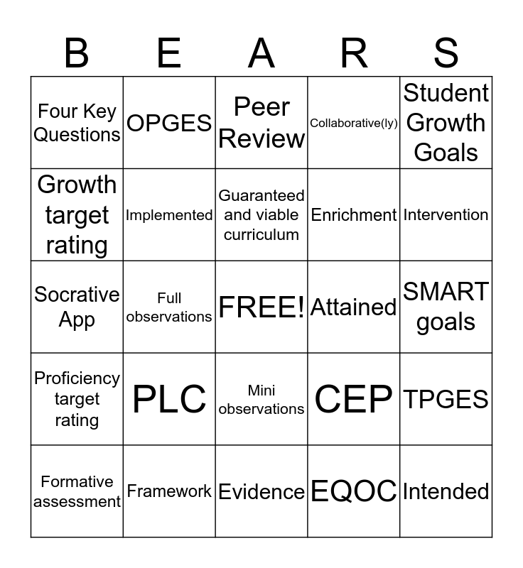 This bingo card has a free space and 24 words: PLC, Framework, Guaranteed and viable curriculum, Formative assessment, Student Growth Goals, Four Key Questions, Growth target rating, OPGES, Attained, Mini observations, Enrichment, Socrative App, CEP, TPGES, Implemented, EQOC, SMART goals, Peer Review, Intervention, Full observations, Intended, Proficiency target rating, Collaborative(ly) and Evidence.