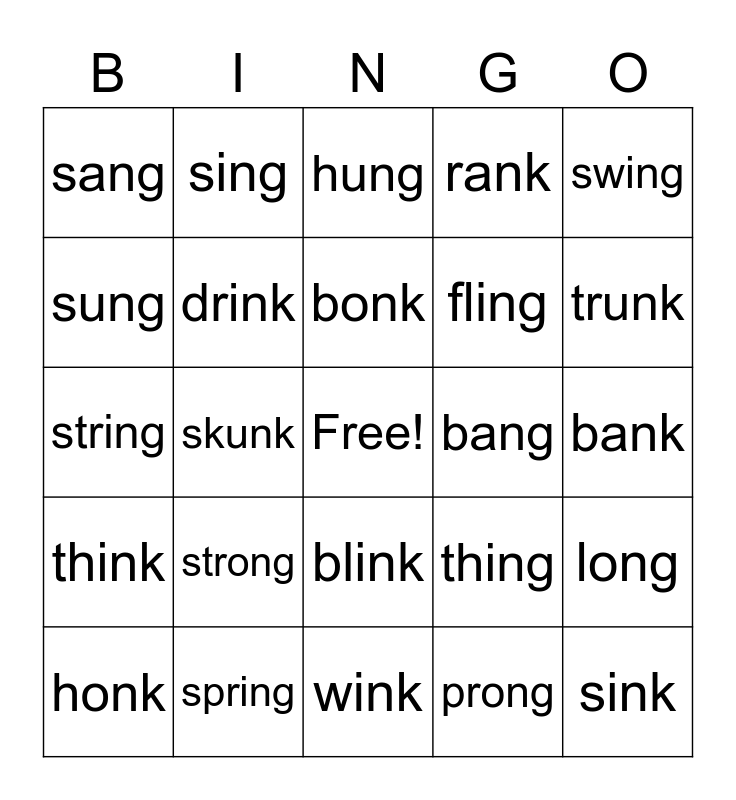 This bingo card has a free space and 24 words: strong, spring, bonk, honk, swing, sang, sung, sing, bang, blink, fling, string, thing, long, drink, prong, bank, hung, trunk, skunk, sink, think, rank and wink.