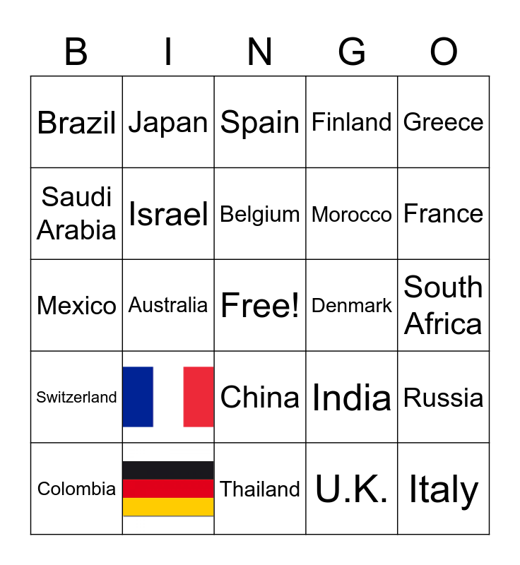 This bingo card has 2 images, a free space and 22 words: Belgium, Colombia, Greece, Brazil, Saudi Arabia, Japan, Denmark, China, Morocco, Mexico, India, Russia, Israel, U.K., South Africa, Spain, France, Australia, Italy, Switzerland, Finland and Thailand.