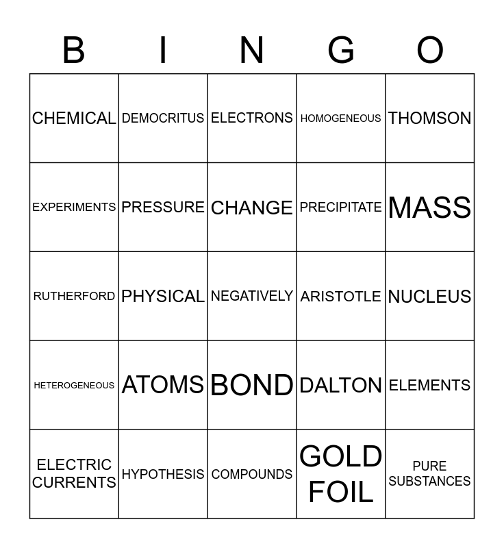 This bingo card has a free space and 24 words: ATOMS, HYPOTHESIS, CHANGE, ELECTRIC CURRENTS, THOMSON, CHEMICAL, EXPERIMENTS, DEMOCRITUS, ARISTOTLE, BOND, PRECIPITATE, RUTHERFORD, DALTON, ELEMENTS, PRESSURE, GOLD FOIL, NUCLEUS, ELECTRONS, MASS, PHYSICAL, PURE SUBSTANCES, HETEROGENEOUS, HOMOGENEOUS and COMPOUNDS.