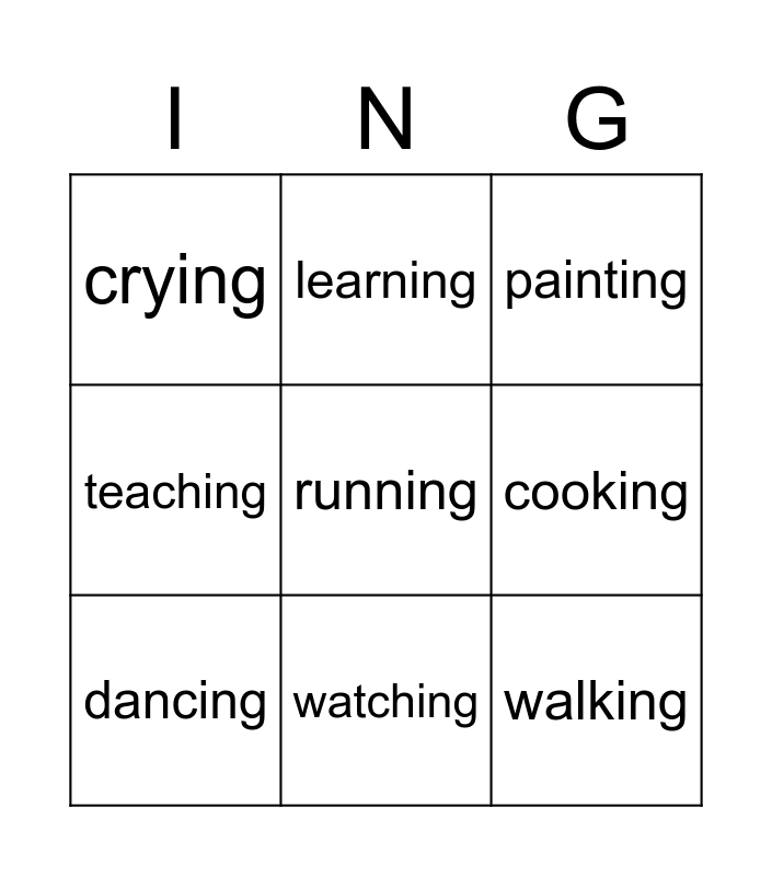 This bingo card has 14 words: painting, walking, dancing, learning, teaching, running, walking, playing, watching, crying, reading, cooking, painting and rainning.
