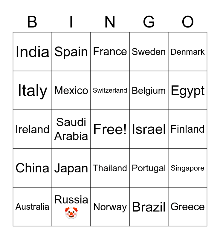 This bingo card has a free space and 24 words: Japan, Russia 🤡, Switzerland, Australia, Denmark, India, Italy, Spain, Israel, Thailand, Belgium, Ireland, Portugal, Singapore, Mexico, Brazil, Finland, France, Egypt, Saudi Arabia, Greece, China, Sweden and Norway.