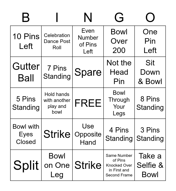 This bingo card has a free space and 25 words: Strike, Strike, Spare, Split, One Pin Left, 10 Pins Left, Gutter Ball, Celebration Dance Post Roll, Bowl Through Your Legs, Use Opposite Hand, Not the Head Pin, 5 Pins Standing, 4 Pins Standing, 3 Pins Standing, 7 Pins Standing, 6 Pins Standing, 8 Pins Standing, Even Number of Pins Left, Sit Down & Bowl, Hold hands with another play and bowl, Take a Selfie & Bowl, Bowl on One Leg, Bowl with Eyes Closed, Bowl Over 200 and Same Number of Pins Knocked Over in First and Second Frame.