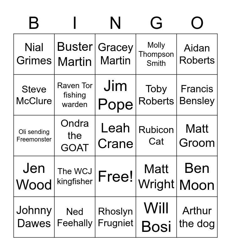 This bingo card has 26 words: Free!, Will Bosi, Jim Pope, Ned Feehally, Aidan Roberts, Nial Grimes, Steve McClure, Buster Martin, Matt Groom, Matt Wright, Toby Roberts, Oli sending Freemonster, Ben Moon, Johnny Dawes, Ondra the GOAT, Shauna Coxey, Molly Thompson Smith, Jen Wood, Gracey Martin, Leah Crane, Francis Bensley, Rhoslyn Frugniet, Rubicon Cat, The WCJ kingfisher, Raven Tor fishing warden and Arthur the dog.