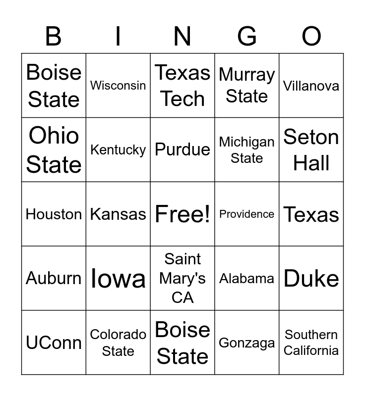 This bingo card has a free space and 32 words: Gonzaga, Arizona, Kansas, Baylor, Auburn, Kentucky, Villanova, Duke, Wisconsin, Tennessee, Purdue, Texas Tech, UCLA, Illinois, Providence, Arkansas, UConn, Houston, Saint Mary's CA, Iowa, Alabama, LSU, Texas, Colorado State, Southern California, Murray State, Michigan State, Ohio State, Boise State, Boise State, San Diego State and Seton Hall.