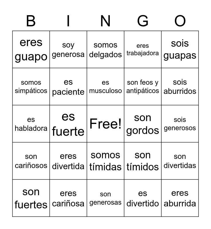 This bingo card has a free space and 34 words: soy delgada, es divertido, eres hablador, es trabajador, son cariñosos, es paciente, sois guapas, son fuertes, soy generosa, eres simpática, es musculoso, somos delgados, son bajos y feos, son altos y guapos, son gordos, sois aburridos, eres cariñosa, es habladora, eres divertida, son tímidos, somos tímidas, son pacientes, eres guapo, sois generosos, son generosas, eres aburrida, eres trabajadora, son trabajadores, son feos y antipáticos, somos simpáticos, eres musculosa, es fuerte, son divertidas and somos pacientes.