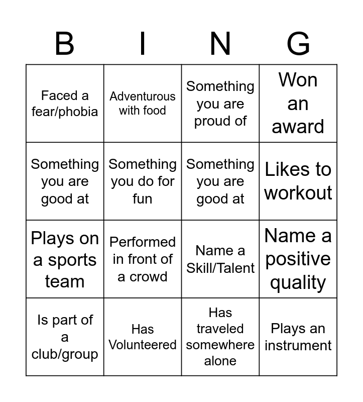 This bingo card has 16 words: Has Volunteered, Name a positive quality, Something you are proud of, Faced a fear/phobia, Plays on a sports team, Adventurous with food, Name a Skill/Talent, Has traveled somewhere alone, Something you are good at, Something you do for fun, Is part of a club/group, Won an award, Performed in front of a crowd, Likes to workout, Something you are good at and Plays an instrument.