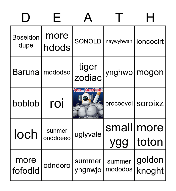 This bingo card has a free space and 24 words: sunmer onddoeeo, odndoro, tiger zodiac, more fofodld, loncoclrt, Boseidon dupe, Baruna, more hdods, procoovol, uglyvale, ynghwo, boblob, small ygg, more toton, mododso, summer mododos, soroixz, SONOLD, mogon, roi, goldon knoght, loch, naywyhwan and summer yngnwjo.