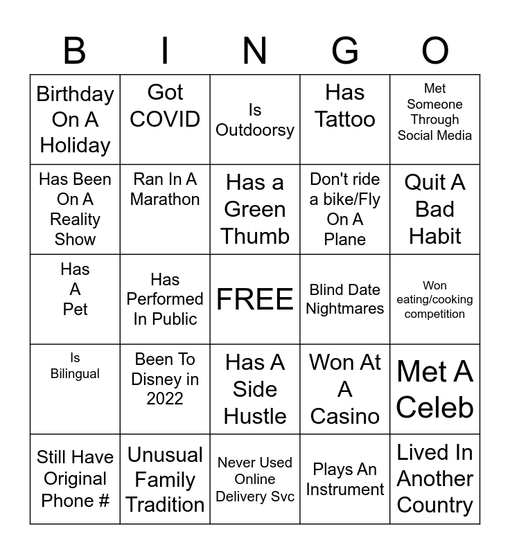 This bingo card has a free space and 24 words: Been To Disney in 2022, Unusual Family Tradition, Has a Green Thumb, Still Have Original Phone #, Met Someone Through Social Media, Birthday On A Holiday, Has Been On A Reality Show, Got COVID, Blind Date Nightmares, Has A Side Hustle, Don't ride a bike/Fly On A Plane, Has A Pet, Won At A Casino, Met A Celeb, Ran In A Marathon, Plays An Instrument, Won eating/cooking competition, Is Outdoorsy, Quit A Bad Habit, Has Performed In Public, Lived In Another Country, Is Bilingual, Has Tattoo and Never Used Online Delivery Svc.