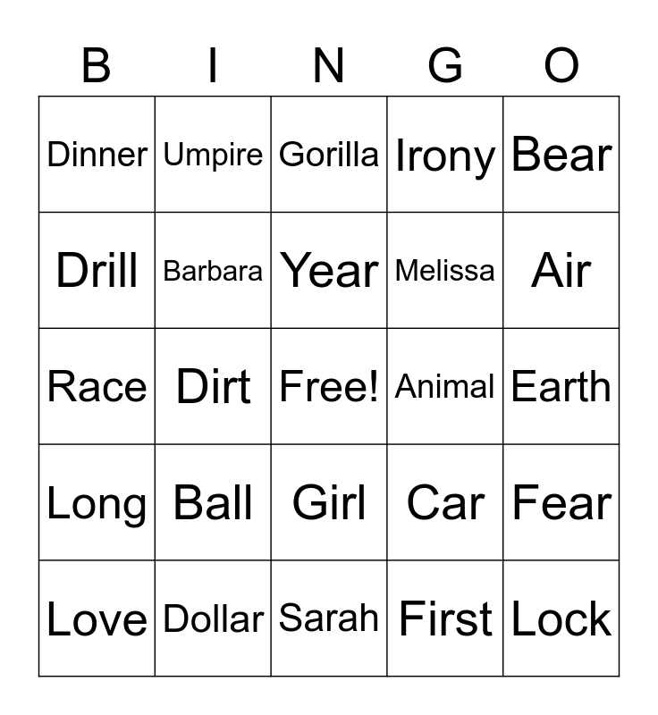 This bingo card has a free space and 29 words: Love, Luck, Dirt, Ariana, Dinner, Gorilla, Barbara, Ball, Animal, Dollar, Earth, Lock, Sarah, First, Air, Olivia, Girl, Long, Bear, Race, Car, Sloth, Melissa, Drill, Irony, Umpire, Fear, Year and Oreo.