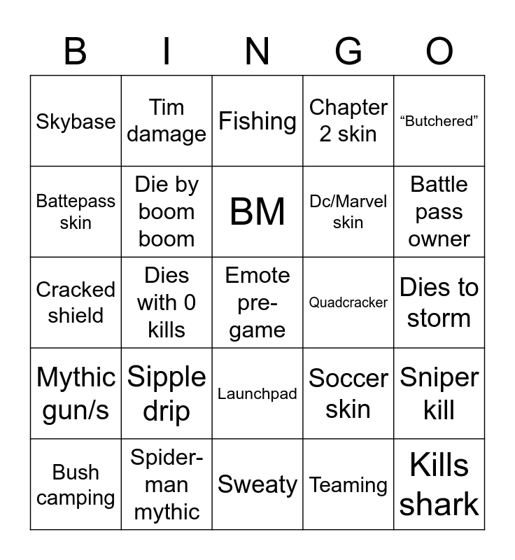 This bingo card has a free space and 24 words: Sipple drip, Spider-man mythic, BM, Bush camping, “Butchered”, Skybase, Battepass skin, Tim damage, Quadcracker, Launchpad, Dc/Marvel skin, Cracked shield, Soccer skin, Sniper kill, Die by boom boom, Teaming, Dies to storm, Fishing, Battle pass owner, Dies with 0 kills, Kills shark, Mythic gun/s, Chapter 2 skin and Sweaty.