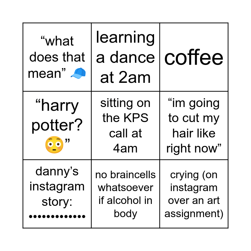 This bingo card has a free space and 8 words: “im going to cut my hair like right now”, coffee, learning a dance at 2am, danny’s instagram story: •••••••••••••, “what does that mean” 🧢, crying (on instagram over an art assignment), “harry potter? 😳” and no braincells whatsoever if alcohol in body.