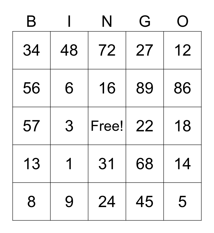 This bingo card has a free space and 25 words: 1, 24, 16, 8, 12, 34, 56, 48, 22, 31, 89, 57, 68, 14, 6, 37, 18, 72, 86, 3, 5, 9, 13, 27 and 45.