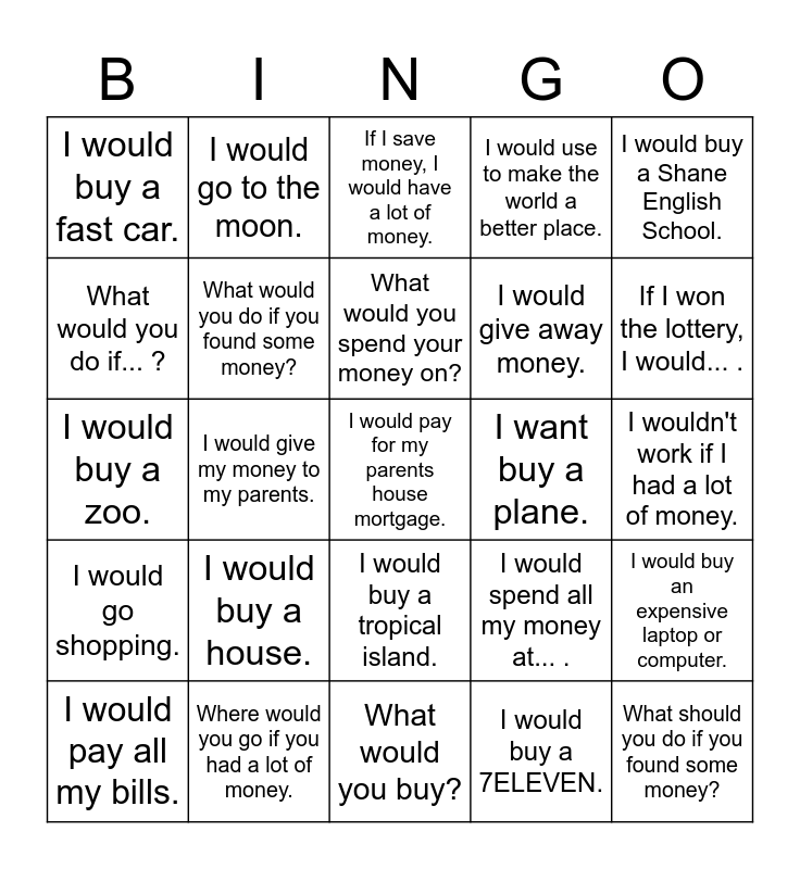 This bingo card has 25 words: I would buy a house., What would you buy?, What would you spend your money on?, I would pay all my bills., I would buy a Shane English School., I would buy a fast car., What would you do if... ?, I would go to the moon., I want buy a plane., I would buy a tropical island., I would give away money., I would buy a zoo., I would spend all my money at... ., I would buy an expensive laptop or computer., What would you do if you found some money?, What should you do if you found some money?, I wouldn't work if I had a lot of money., If I save money, I would have a lot of money., If I won the lottery, I would... ., I would give my money to my parents., I would pay for my parents house mortgage., Where would you go if you had a lot of money., I would go shopping., I would use to make the world a better place. and I would buy a 7ELEVEN..