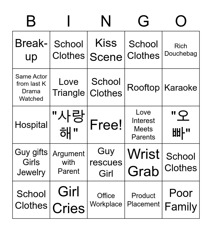 This bingo card has a free space and 29 words: School Clothes, Flashback to Young Age, "사랑해", Drunk Scene, Break-up, Kiss Scene, Love Triangle, Argument with Parent, Love Interest Meets Parents, Girl Cries, "오빠", Poor Family, Office Workplace, Product Placement, Karaoke, 애교, Guy rescues Girl, Guy gifts Girls Jewelry, Rich Douchebag, Hospital, Wrist Grab, 10+ Second Boy and Girl Still Shot, Rooftop, Same Actor from last K Drama Watched, School Clothes, School Clothes, School Clothes, School Clothes and School Clothes.