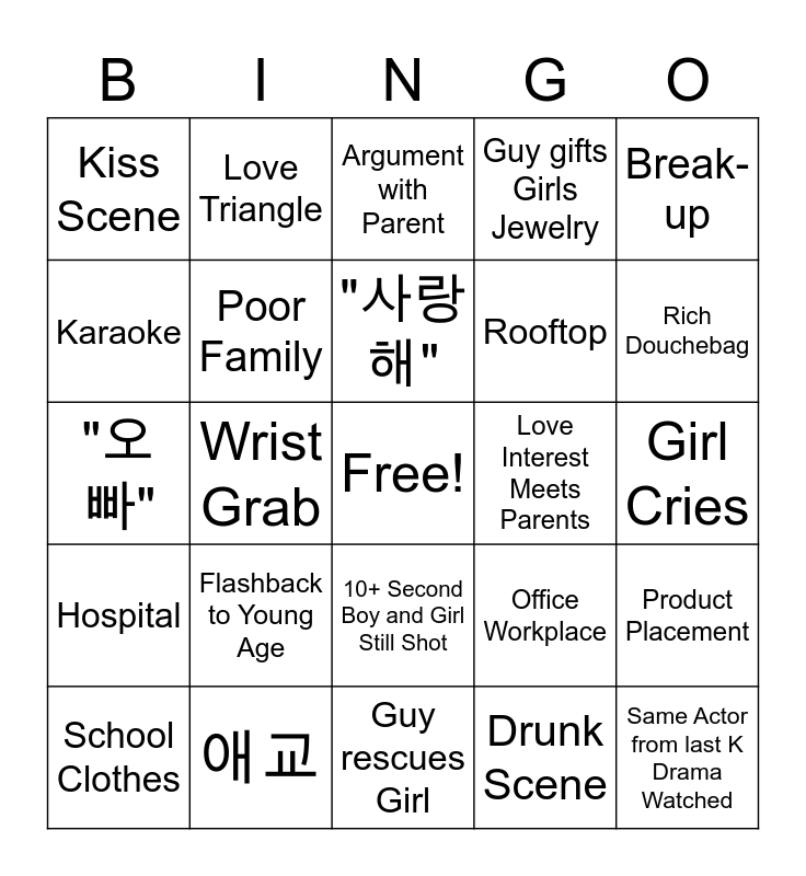 This bingo card has a free space and 24 words: School Clothes, Flashback to Young Age, "사랑해", Drunk Scene, Break-up, Kiss Scene, Love Triangle, Argument with Parent, Love Interest Meets Parents, Girl Cries, "오빠", Poor Family, Office Workplace, Product Placement, Karaoke, 애교, Guy rescues Girl, Guy gifts Girls Jewelry, Rich Douchebag, Hospital, Wrist Grab, 10+ Second Boy and Girl Still Shot, Rooftop and Same Actor from last K Drama Watched.