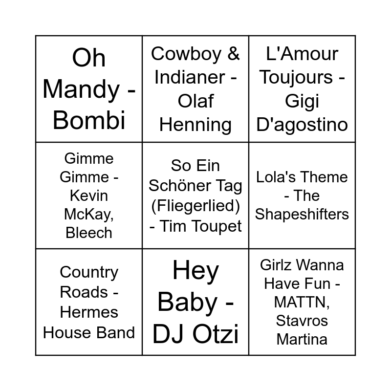 This bingo card has 33 words: Vol Gas!! - Feestlift, Living On Video - Paki, Johnny Däpp - Lorenz Büffel, Live Is Life - Hermes House Band ft. DJ Otzi, Disco Pogo - Die Atzen Frauenarzt, Country Roads - Hermes House Band, So Ein Schöner Tag (Fliegerlied) - Tim Toupet, Atemlos Durch Die Nacht - Helene Fischer, Cowboy & Indianer - Olaf Henning, 99 Luftballons - Nena, Hey Baby - DJ Otzi, L'Amour Toujours - Gigi D'agostino, Infinity 2008 - Guru, I Will Survive (Lalala) - Hermes House Band, Narcotic - Liquido, Hulapalu - Andreas Gabalier, Liberté - Parla, Pardoux, Ik Moet Zuipen! - PartyFriex, Schorre Chef, In den Bergen (Da bin ich daheim) - Mia Julia, DJ Mico, Let It Be - Feestteam, Hey, Wir Woll'n Die Eisbären seh'n - Sound Convoy, Sweet Caroline - The Partyjocks, Oh Mandy - Bombi, Schatzi Schenk Mir Ein Foto - Mickie Krause, Trompetisto - Sjaak, Water Verve - Mark van Dale, Enrico, Gimme Gimme - Kevin McKay, Bleech, Girlz Wanna Have Fun - MATTN, Stavros Martina, Lola's Theme - The Shapeshifters, Mambo No. 5 - Lou Bega, I Want It That Way - Backstreet Boys, My My My - Armand van Helden and Casanova - Ultimate Kaos.