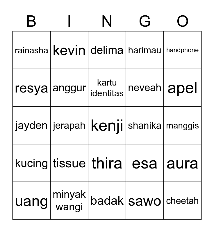 This bingo card has a free space and 24 words: tissue, minyak wangi, kartu identitas, uang, handphone, rainasha, resya, kevin, shanika, thira, neveah, jayden, esa, aura, anggur, sawo, manggis, delima, apel, jerapah, cheetah, kucing, harimau and badak.