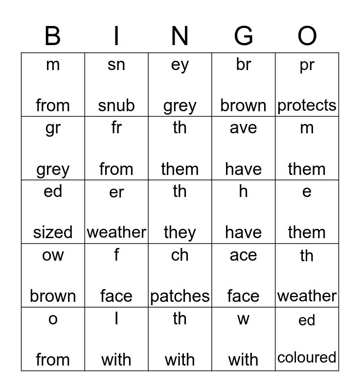 This bingo card has 25 words: f face, th with, th them, o from, pr protects, m from, gr grey, sn snub, h have, ch patches, ave have, ed sized, ace face, th weather, fr from, ed coloured, e them, ey grey, m them, er weather, th they, I with, ow brown, br brown and w with.