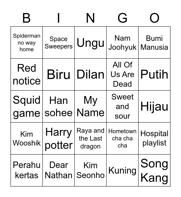 This bingo card has a free space and 24 words: Harry potter, Dear Nathan, Dilan, Perahu kertas, Bumi Manusia, Spiderman no way home, Red notice, Space Sweepers, Sweet and sour, Raya and the Last dragon, All Of Us Are Dead, Squid game, Hometown cha cha cha, Hospital playlist, Biru, Kuning, Hijau, Ungu, Putih, Han sohee, Song Kang, Kim Wooshik, Nam Joohyuk and Kim Seonho.