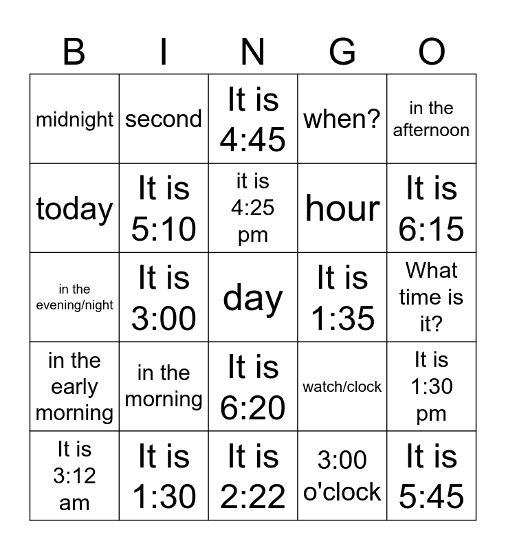 This bingo card has 30 words: It is 1:30, It is 2:15, It is 3:00, noon, midnight, It is 4:45, It is 5:10, It is 6:20, It is 1:35, It is 2:22, What time is it?, day, 3:00 o'clock, It is 5:45, It is 6:15, It is 6:32, watch/clock, in the early morning, in the morning, in the afternoon, in the evening/night, minute, second, hour, today, when?, It is 1:30 pm, It is 3:12 am, it is 4:25 pm and It is 8:20 pm.