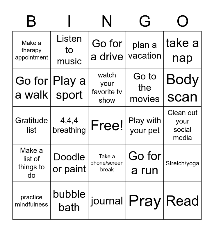 This bingo card has a free space and 24 words: Doodle or paint, bubble bath, watch your favorite tv show, practice mindfulness, take a nap, Make a therapy appointment, Go for a walk, Listen to music, Play with your pet, Take a phone/screen break, Go to the movies, Gratitude list, Go for a run, Stretch/yoga, Play a sport, Pray, Clean out your social media, Go for a drive, Body scan, 4,4,4 breathing, Read, Make a list of things to do, plan a vacation and journal.