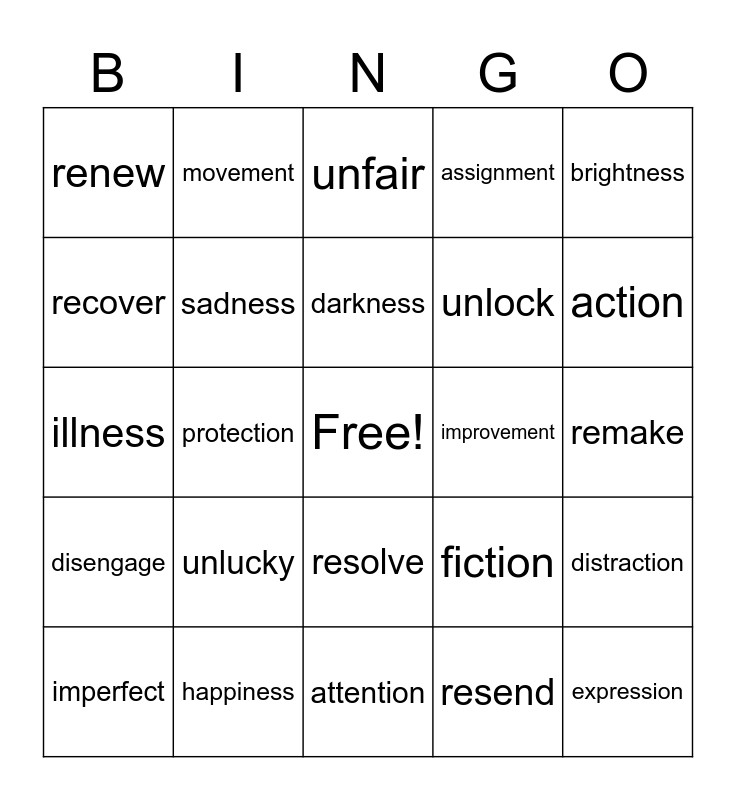 This bingo card has a free space and 29 words: imperfect, movement, protection, discover, renew, unfair, sadness, unlucky, improvement, happiness, remake, expression, attention, resend, action, correction, resolve, disengage, brightness, illness, fiction, government, unlock, recover, assignment, movement, distraction, darkness and remove.