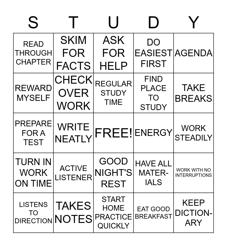 This bingo card has a free space and 24 words: ACTIVE LISTENER, TAKES NOTES, REGULAR STUDY TIME, LISTENS TO DIRECTION, AGENDA, READ THROUGH CHAPTER, REWARD MYSELF, SKIM FOR FACTS, ENERGY, GOOD NIGHT'S REST, FIND PLACE TO STUDY, PREPARE FOR A TEST, HAVE ALL MATER- IALS, WORK WITH NO INTERRUPTIONS, CHECK OVER WORK, EAT GOOD BREAKFAST, WORK STEADILY, ASK FOR HELP, TAKE BREAKS, WRITE NEATLY, KEEP DICTION- ARY, TURN IN WORK ON TIME, DO EASIEST FIRST and START HOME PRACTICE QUICKLY.