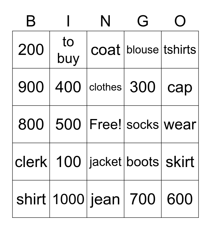 This bingo card has a free space and 24 words: 100, 1000, clothes, shirt, tshirts, 200, 900, to buy, socks, jacket, 300, 800, boots, skirt, 400, 700, wear, coat, cap, 500, 600, clerk, blouse and jean.
