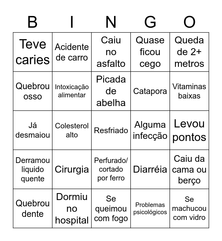 This bingo card has a free space and 24 words: Cirurgia, Dormiu no hospital, Picada de abelha, Quebrou dente, Queda de 2+ metros, Teve caries, Quebrou osso, Acidente de carro, Alguma infecção, Perfurado/ cortado por ferro, Catapora, Já desmaiou, Diarréia, Caiu da cama ou berço, Intoxicação alimentar, Problemas psicológicos, Levou pontos, Caiu no asfalto, Vitaminas baixas, Colesterol alto, Se machucou com vidro, Derramou liquido quente, Quase ficou cego and Se queimou com fogo.