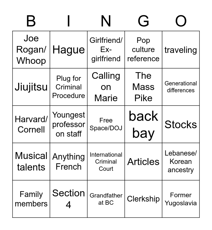 This bingo card has a free space and 24 words: Anything French, Section 4, Calling on Marie, Family members, traveling, Joe Rogan/ Whoop, Jiujitsu, Hague, back bay, International Criminal Court, The Mass Pike, Harvard/ Cornell, Articles, Lebanese/ Korean ancestry, Plug for Criminal Procedure, Clerkship, Stocks, Girlfriend/ Ex-girlfriend, Generational differences, Youngest professor on staff, Former Yugoslavia, Musical talents, Pop culture reference and Grandfather at BC.