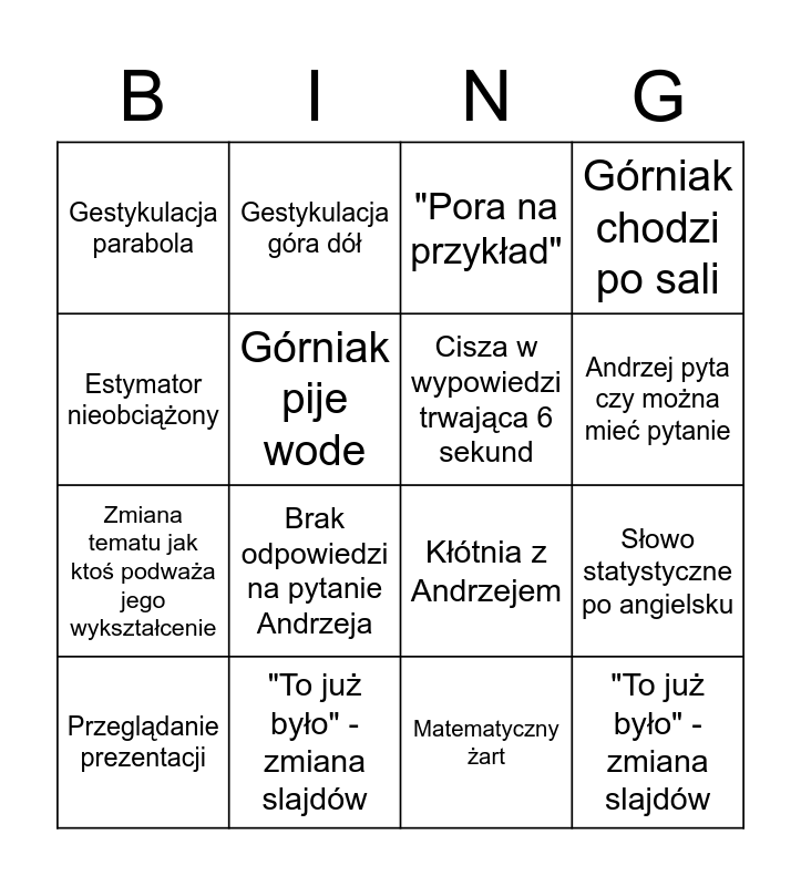 This bingo card has 17 words: Matematyczny żart, Przeglądanie prezentacji, "Pora na przykład", Gestykulacja parabola, Brak odpowiedzi na pytanie Andrzeja, Górniak chodzi po sali, Słowo statystyczne po angielsku, Cisza w wypowiedzi trwająca 6 sekund, Andrzej pyta czy można mieć pytanie, Górniak pije wode, "To już było" - zmiana slajdów, Kłótnia z Andrzejem, Estymator nieobciążony, Gestykulacja góra dół, Zmiana tematu jak ktoś podważa jego wykształcenie, Punkt za wąsy and "To już było" - zmiana slajdów.