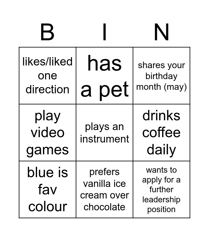 This bingo card has a free space and 8 words: play video games, has a pet, drinks coffee daily, blue is fav colour, shares your birthday month (may), likes/liked one direction, prefers vanilla ice cream over chocolate and wants to apply for a further leadership position.