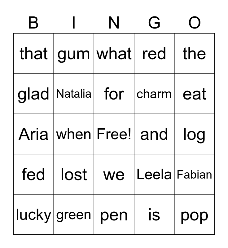 This bingo card has a free space and 24 words: lost, green, for, lucky, the, that, glad, gum, and, we, charm, Aria, Leela, Fabian, Natalia, is, log, what, eat, when, pop, fed, red and pen.