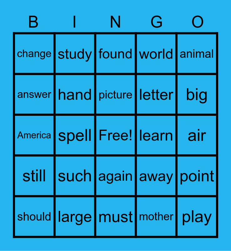 This bingo card has a free space and 28 words: point, page, letter, mother, answer, found, study, still, learn, should, America, world, large, must, big, even, such, hand, picture, again, change, off, play, spell, air, away, animal and house.