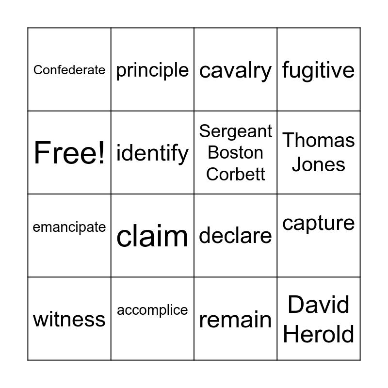 This bingo card has 16 words: accomplice, capture, cavalry, Confederate, emancipate, principle, declare, remain, Free!, identify, witness, fugitive, claim, Thomas Jones, Sergeant Boston Corbett and David Herold.