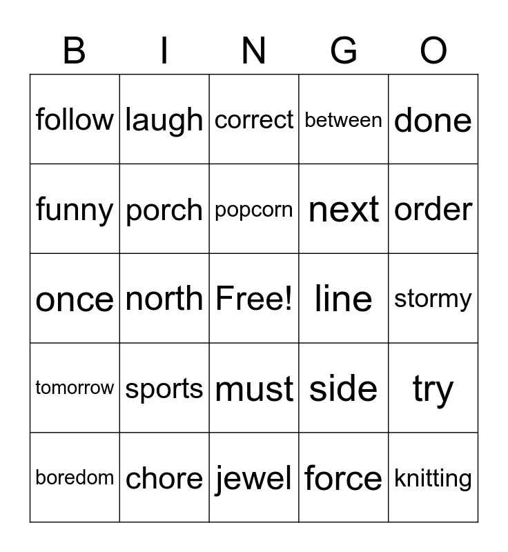 This bingo card has a free space and 24 words: sports, chore, popcorn, boredom, done, follow, funny, laugh, line, must, next, once, side, try, porch, force, stormy, correct, order, north, knitting, tomorrow, between and jewel.