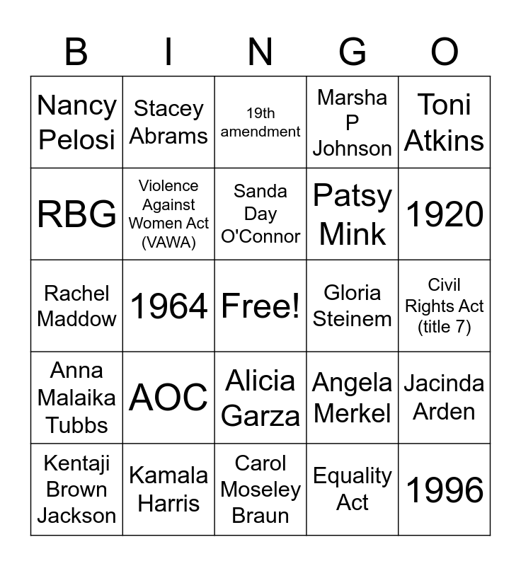 This bingo card has a free space and 24 words: AOC, Kamala Harris, Sanda Day O'Connor, Kentaji Brown Jackson, Toni Atkins, Nancy Pelosi, RBG, Stacey Abrams, Gloria Steinem, Alicia Garza, Patsy Mink, Rachel Maddow, Angela Merkel, Jacinda Arden, Violence Against Women Act (VAWA), Equality Act, Civil Rights Act (title 7), 19th amendment, 1920, 1964, 1996, Anna Malaika Tubbs, Marsha P Johnson and Carol Moseley Braun.